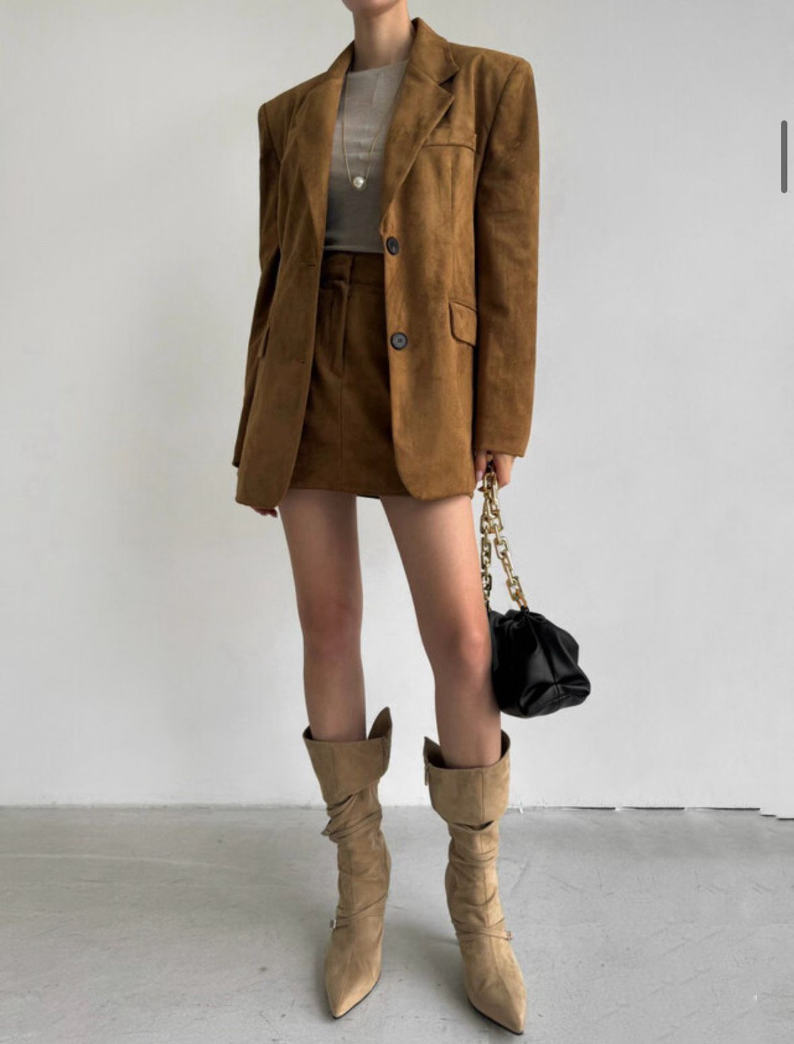 翻領墊肩寬鬆西裝外套/後鬆緊腰短裙