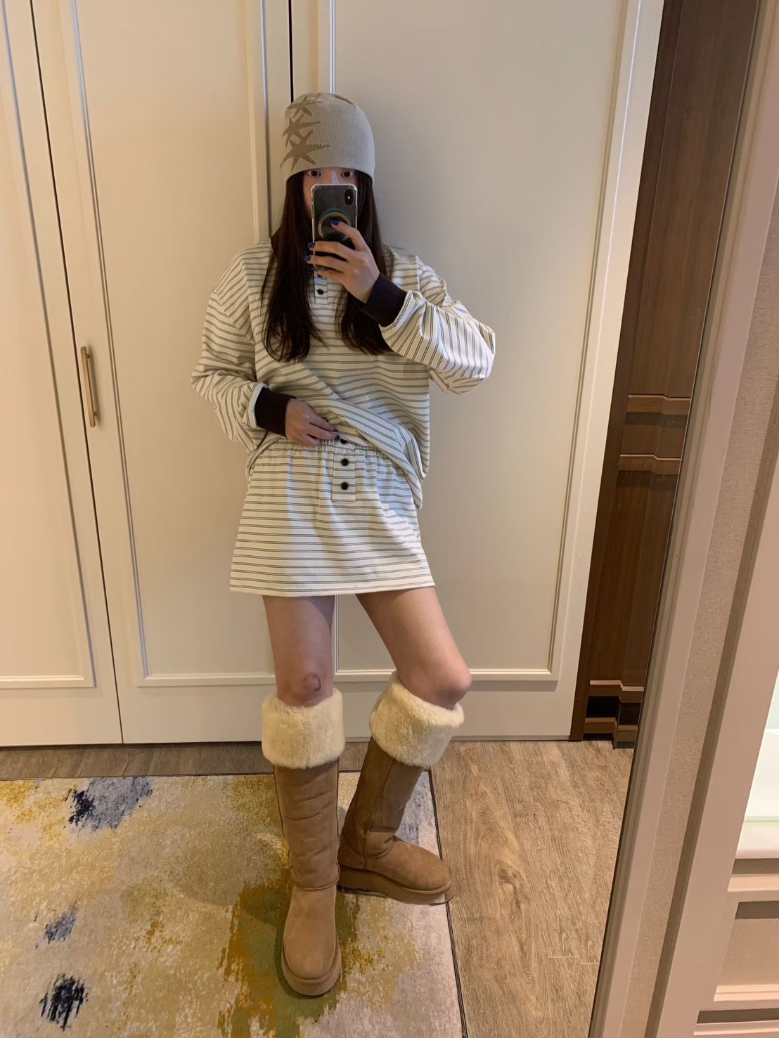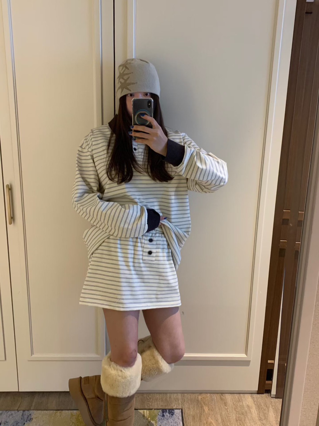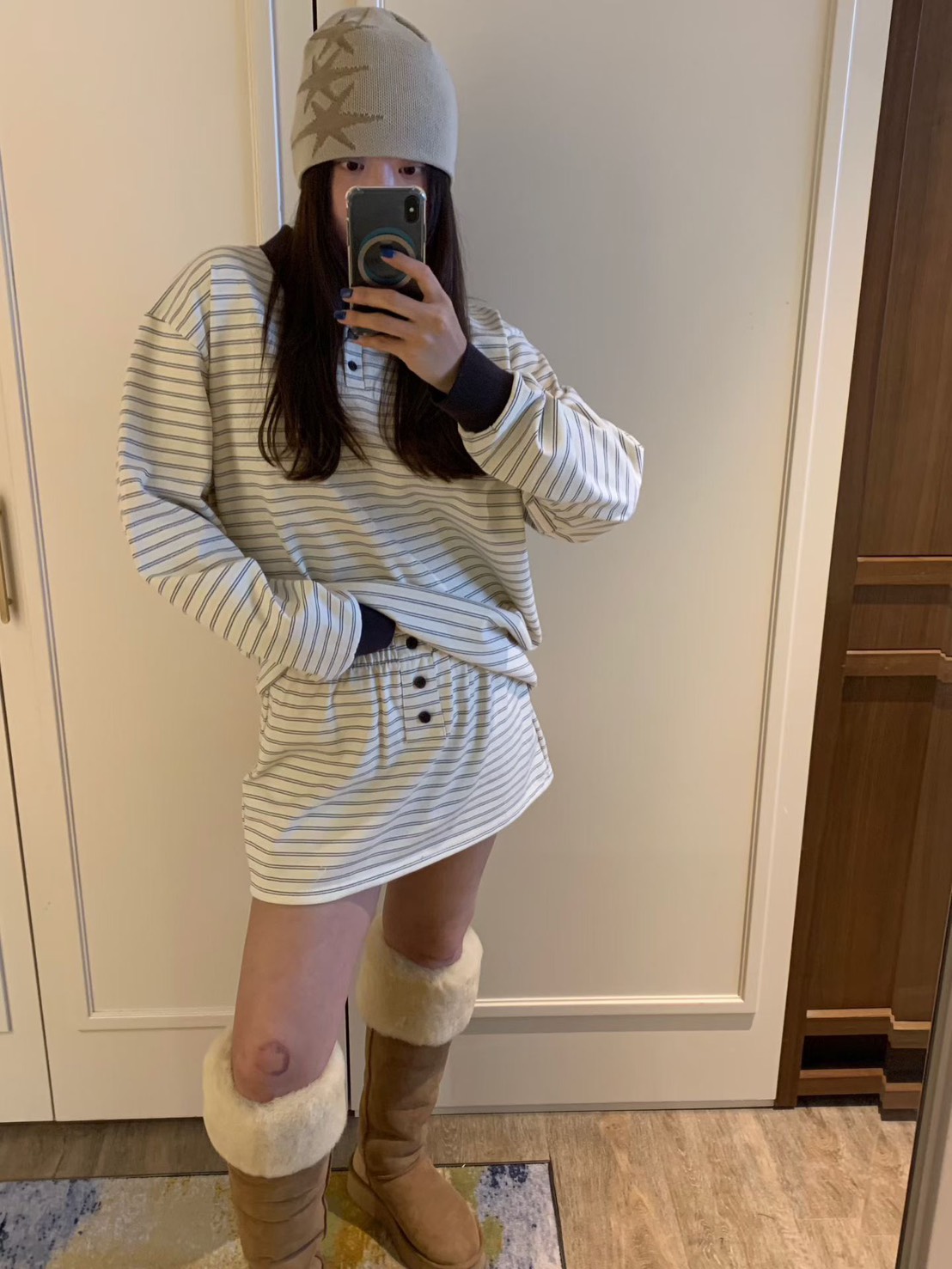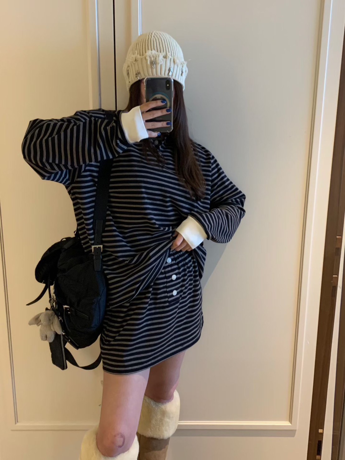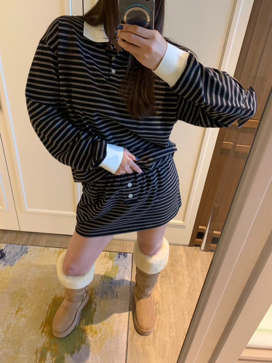 拼色細條紋POLO上衣/鈕扣條紋短裙