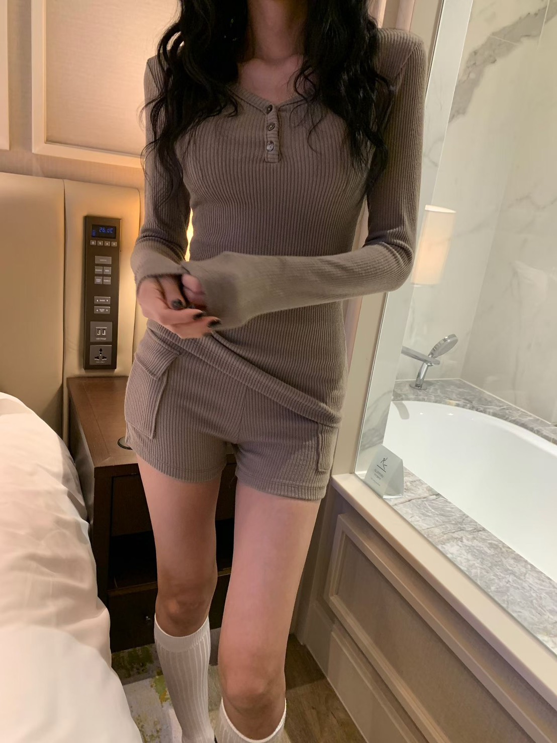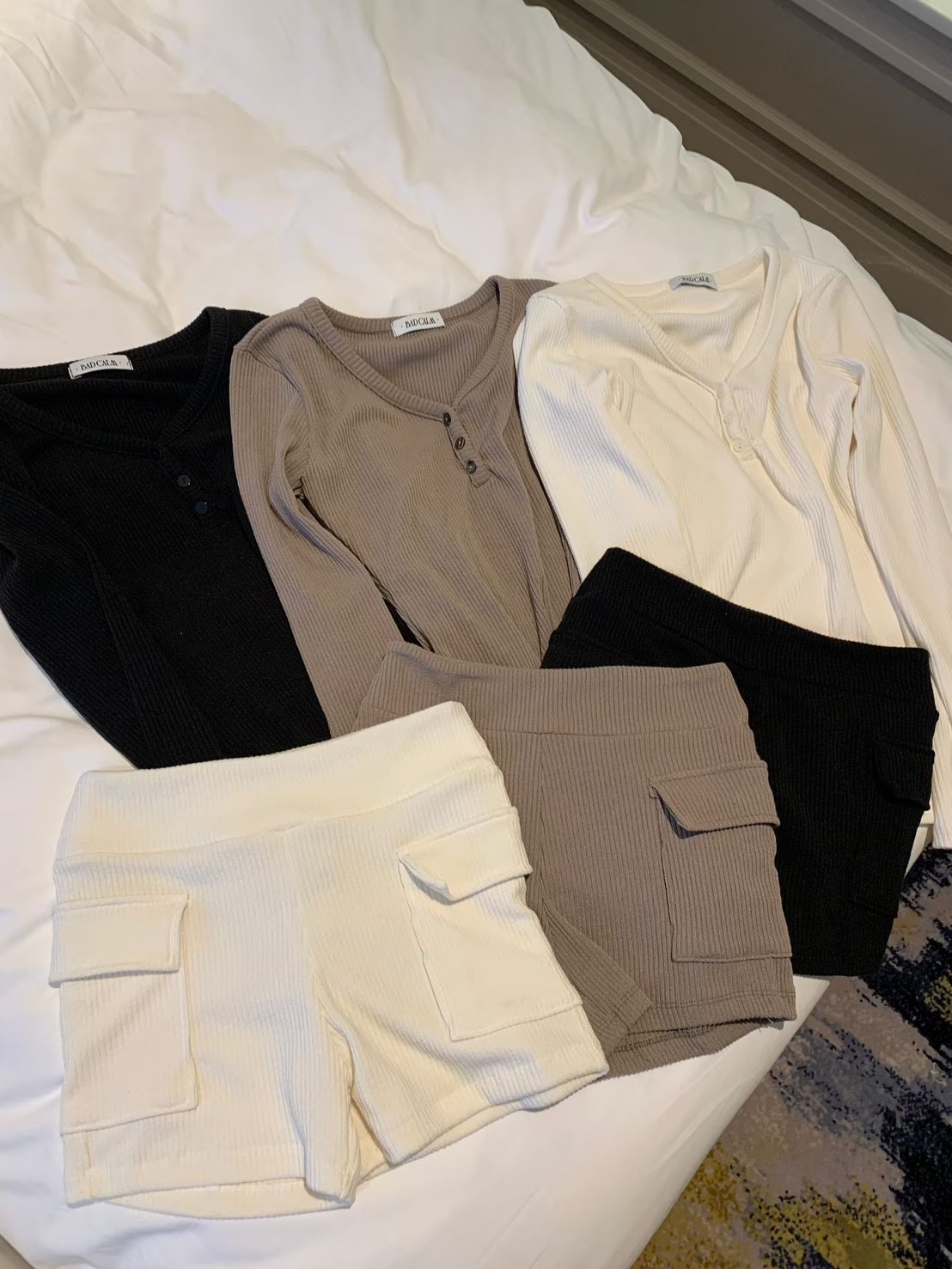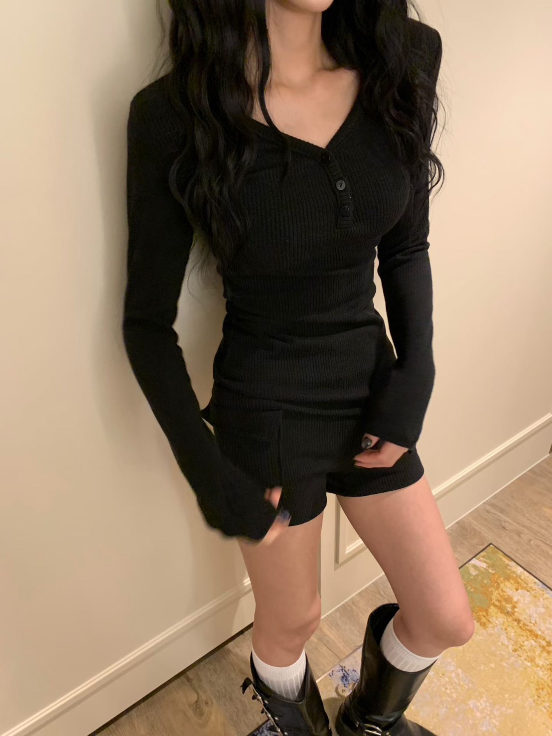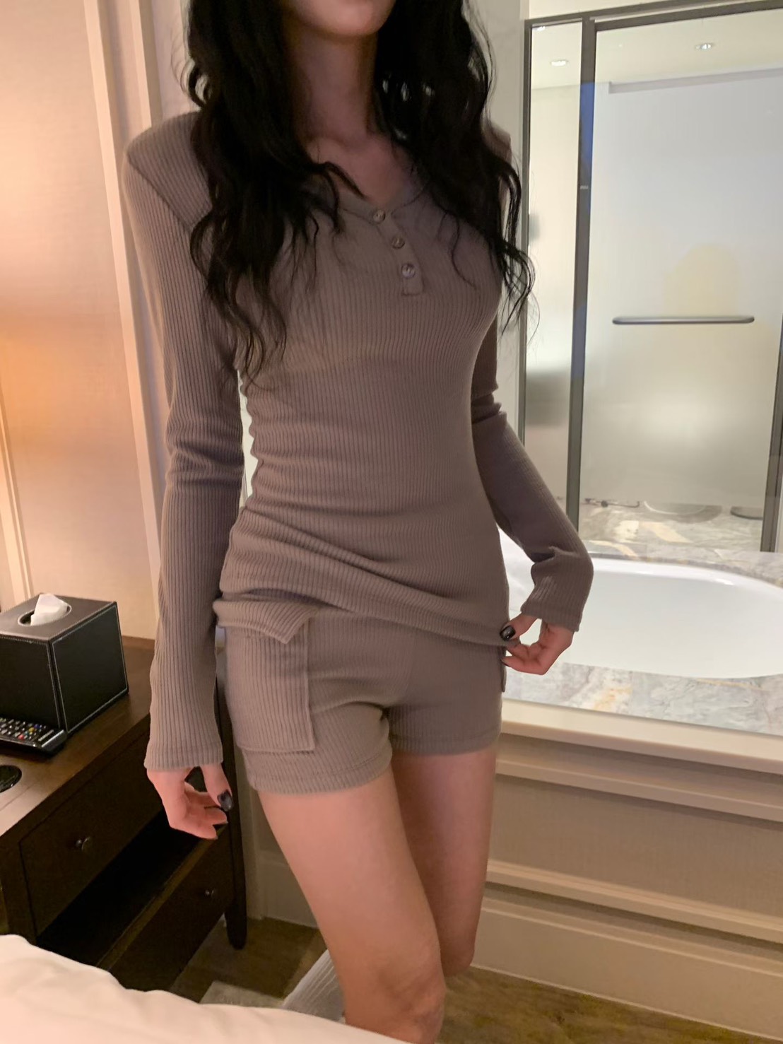 V領坑條羅紋長T+工裝合身小短褲SET